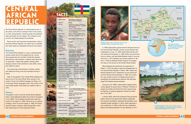 The Encyclopedia of People and Places includes six country volumes, organized alphabetically. A fact box for each country includes that country’s flag, a locator globe, and key information on terrain, government, people, economy, and technology. In these volumes, readers will learn about how the nations of the world have grown and interacted over time.